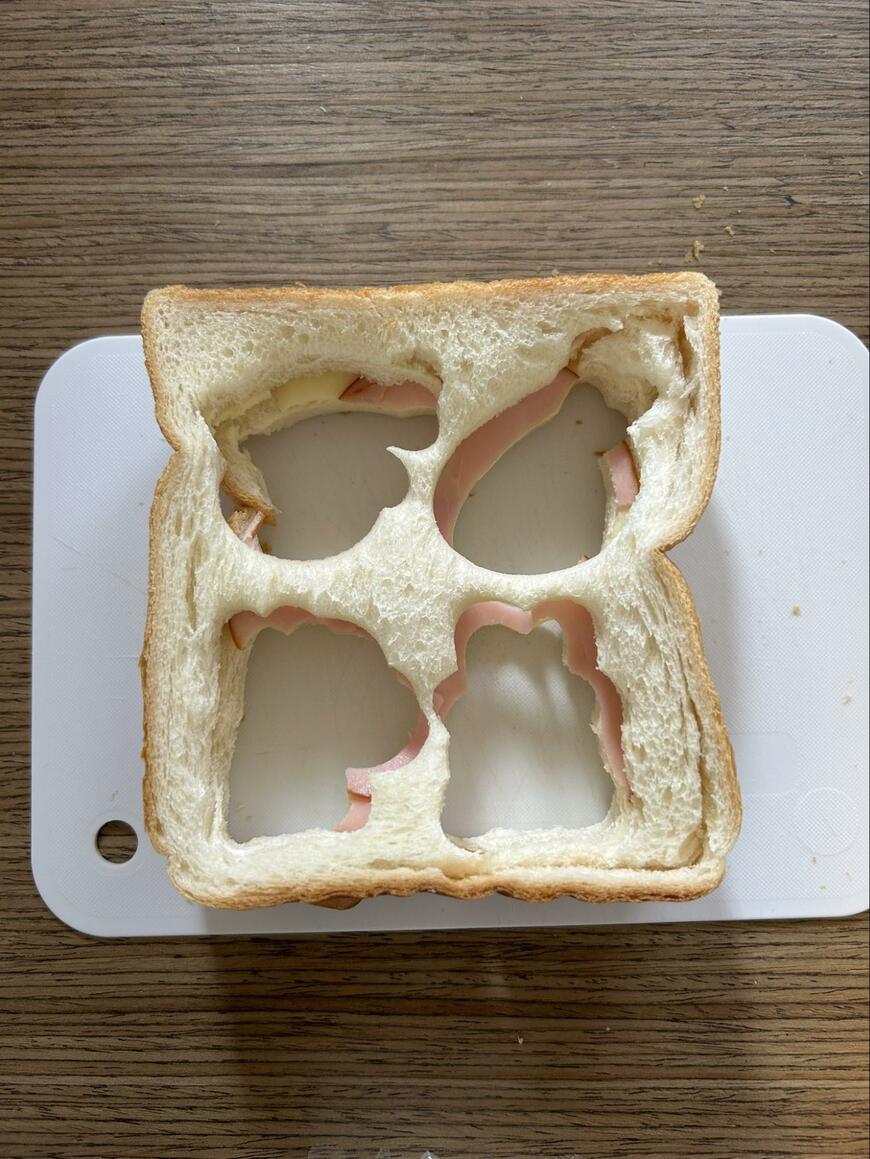 そして2枚目の写真を見ると、母親の朝食が写っていました。くり抜いた後の食パンは「ほとんど耳」といった具合。よく見ると、中からはチーズやハムといったパンの具材が覗いていますね。お子さんのパンは「チーズとハムのサンドウィッチ」だったことが分かります。