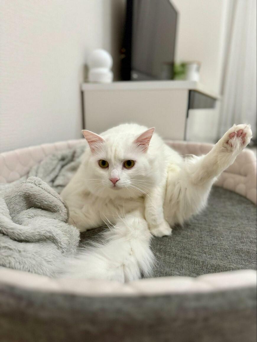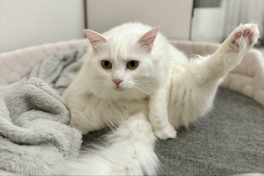「くさかったの…?」というコメントとともに投稿されたのは2枚の写真でした。話題になっているのは、白猫の男の子「マオ」くん。