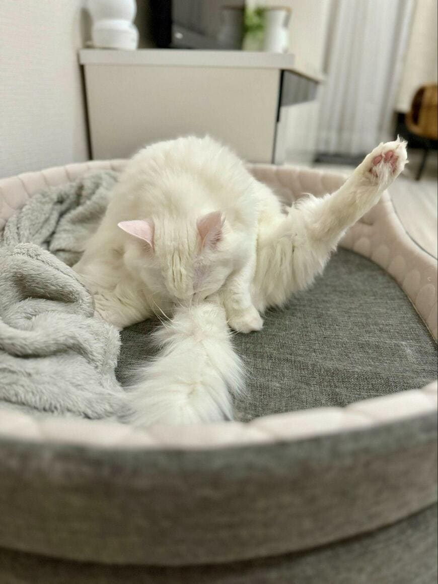 尻尾からおしりにかけて、丹念に毛づくろいをしている様子の猫ちゃん。面白かわいい反応がX(旧Twitter)で注目を集めています。