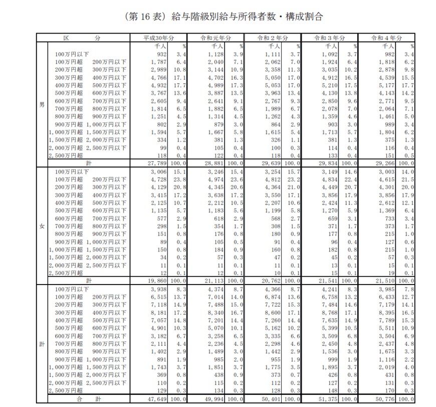 同資料より、男女別・全体ともに、「年収100万円以下~2500万円超」の年収帯ごとの給与所得者数や割合も確認しましょう。