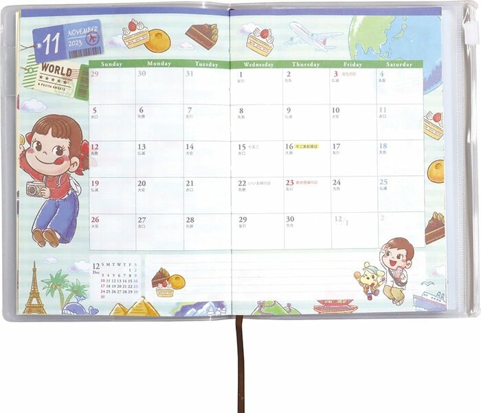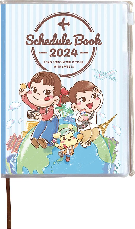毎年人気のスケジュール手帳には、ブック型ふせんが付属しています。今回のデザインテーマは「ワールドツアーwithスイーツ」。世界中を旅行しながら各地で不二家のお菓子を楽しむペコちゃん・ポコちゃん・ドッグの様子をデザインしています。