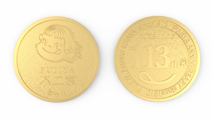 創業日にあたる2023年11月16日(木)限定で、税込1130円以上購入した人に、先着で「113周年ペコちゃんオリジナルメダル」1枚をプレゼント。今年9月にリニューアルした、不二家洋菓子店の新店舗ロゴ入りの2023年限定デザインは必見ですね。