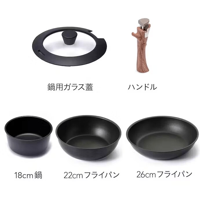 取っ手が外せるフライパンの関連アイテムを、5点まとめたセット商品です。セット内容は、鍋用ガラス蓋、ハンドル、18cm鍋、22cmフライパン、26cmフライパンとなっています。