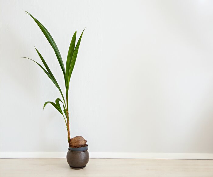 大きなココナッツの実から若々しい芽を伸ばす癒し系観葉植物、ココヤシ(ヤシの木)。自生地では10〜30メートルにもなる大型樹木ですが、生長速度が遅くゆっくりとしか大きくならないため鉢植えでも育てることができます。