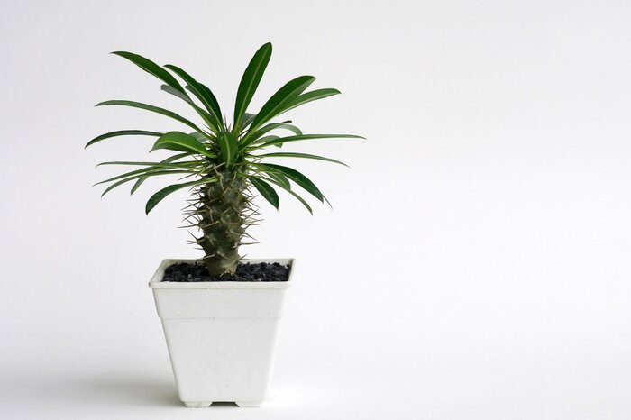 近年注目されているビザールプランツ(珍奇植物)のなかでも、特に人気が高いパキポディウム・ラメリー。金棒のような太い幹には鋭いトゲがあり、堂々とした姿には他を寄せ付けぬ威厳さえ感じます。