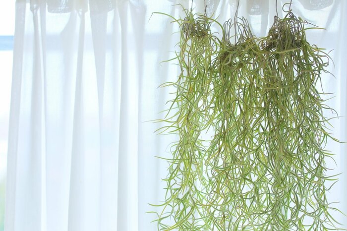 エアプランツの一種であるウスネオイデスは、小スペースを飾るのに最適。上から吊るしたり、壁にかけて飾ったりできるので、狭い空間でもグリーンを楽しむことができます。