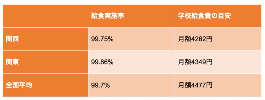 関西も関東も、給食実施率は全国平均より高く、給食費の目安は全国平均より安いことが分かります。