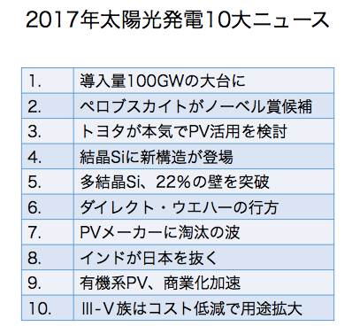 今回、17年のPV10大ニュースを選出し、市場および技術開発の現況を振り返るとともに、18年の動向を展望する。