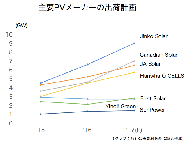 17年の出荷量はJinko Solarの8.5~9.0GWを筆頭に、JA Solar、Canadian Solar、Hanwha Q Cellsも6~7GWを計画するなど、4社が激しい出荷競争を繰り広げている。