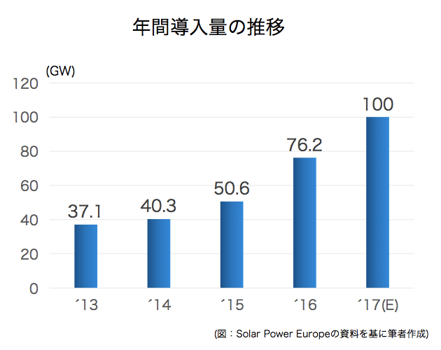 2017年の世界の太陽光発電(PV)導入量は、ついに100GWの大台に達する見込みです。その背景には、中国市場の急拡大と欧州がプラス成長に転じたことがあります。 -