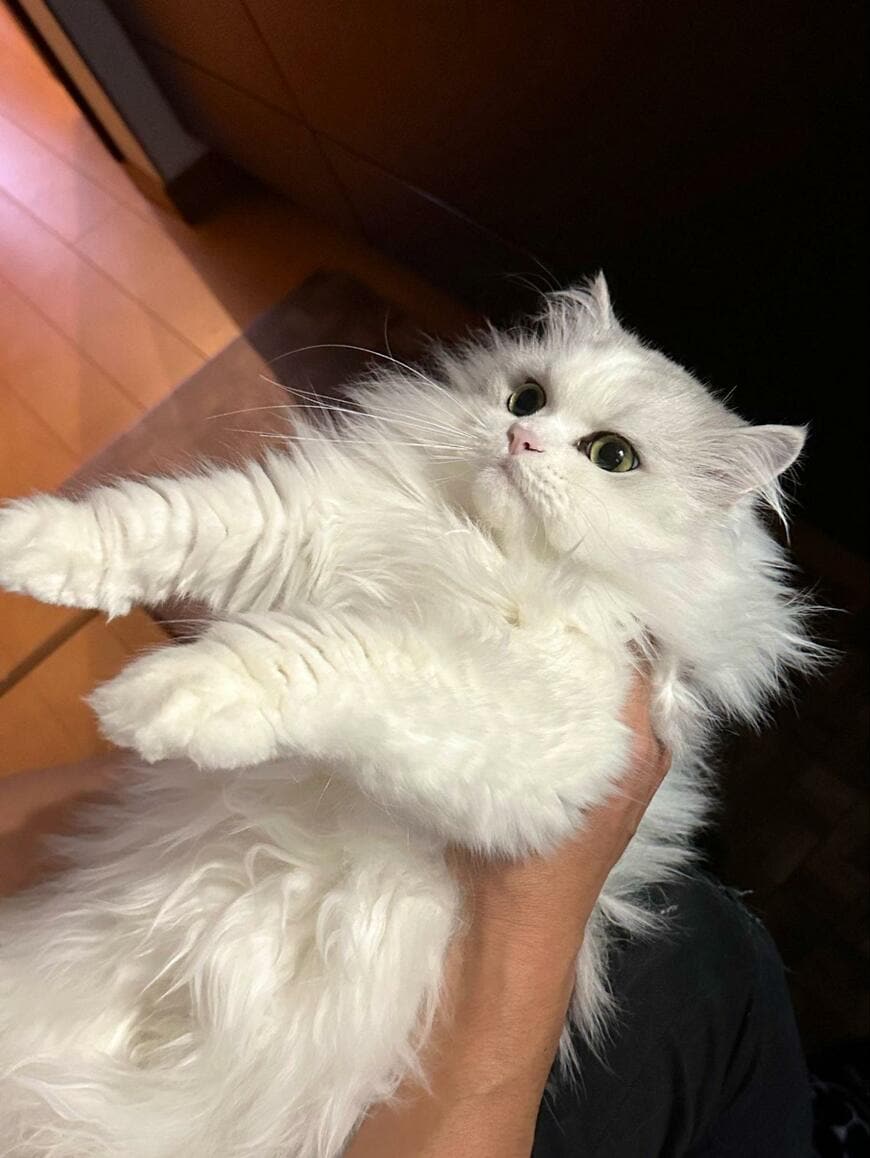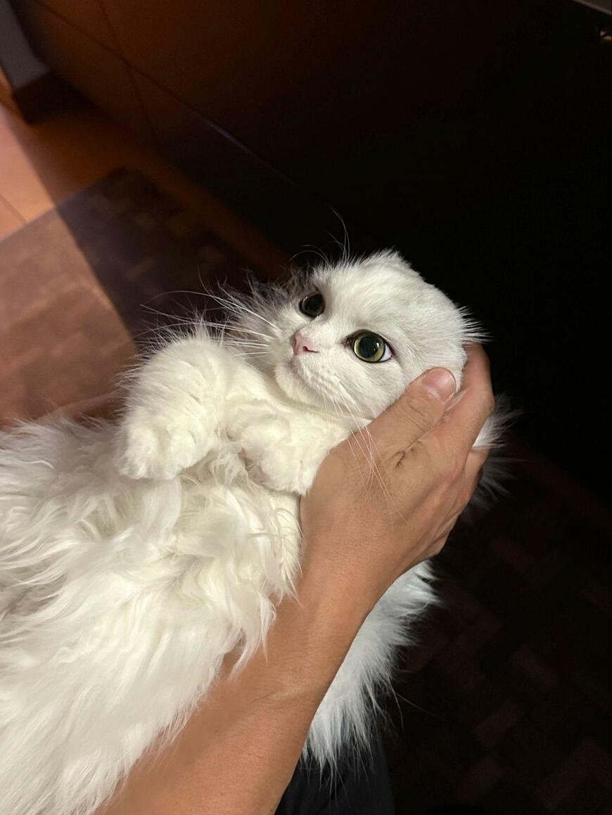 1枚目に写るノーマンくんは飼い主さんに抱っこされているのでしょうか。お腹を見せた状態で静かに一点を見つめています。