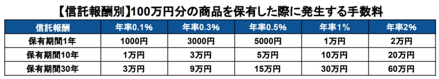 信託報酬ごとにみた100万円分の投資商品を保有した場合に発生する手数料は以下のとおりです。