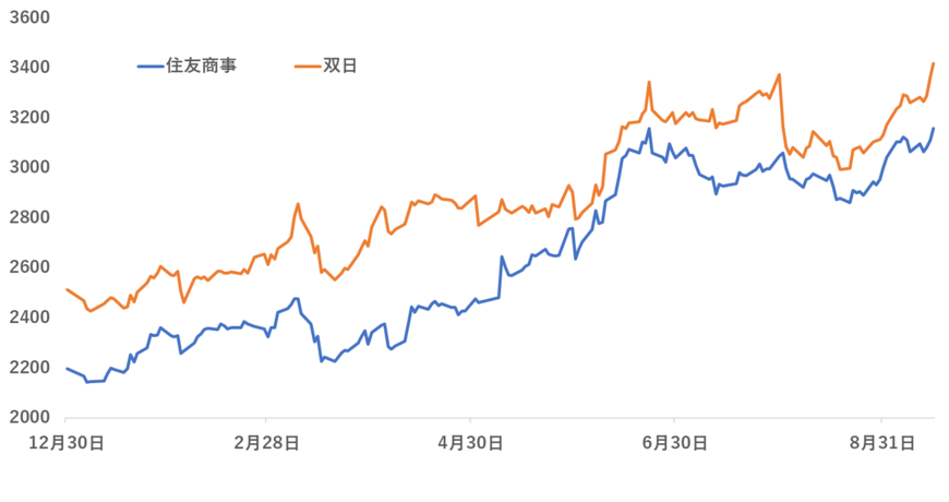住友商事・双日の2022年末以降の株価の推移(終値ベース:円)2022年12月30日~2023年9月15日