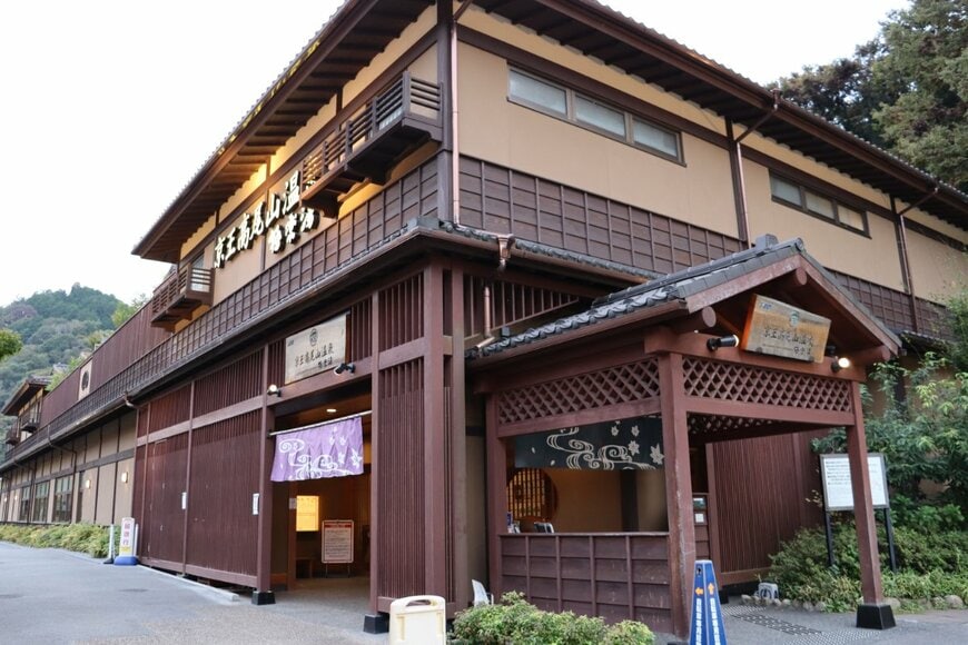 連絡通路を抜けると、目の前に現れるのが「京王高尾山温泉 極楽湯」。落ち着いた感じの建物で温泉旅館のような佇まいです。夕方以降はライトアップされるので、また違った雰囲気になりますよ。