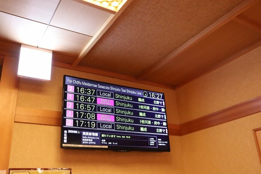 また、京王線の電光掲示板が設置されているのも「京王高尾山温泉 極楽湯」ならではの設備。館内で過ごしながら、帰りの電車の時間や遅延情報をリアルタイムで確認できますよ。