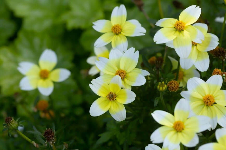 ウィンターコスモスとも呼ばれるビデンスは、イエローやホワイト、ピンクの花が咲く多年草(もしくは一・ニ年草)です。イエローとホワイトのバイカラーの品種はポップな雰囲気で、とてもキュート。可愛らしい雰囲気のガーデンにもおすすめです。