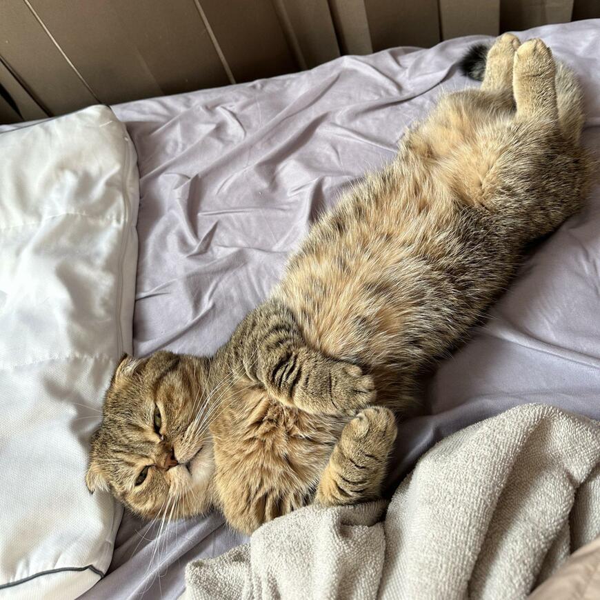 パパさんの起床とともに、愛らしい寝起き姿を見せる猫さんがX(旧Twitter)で注目を集めています。
