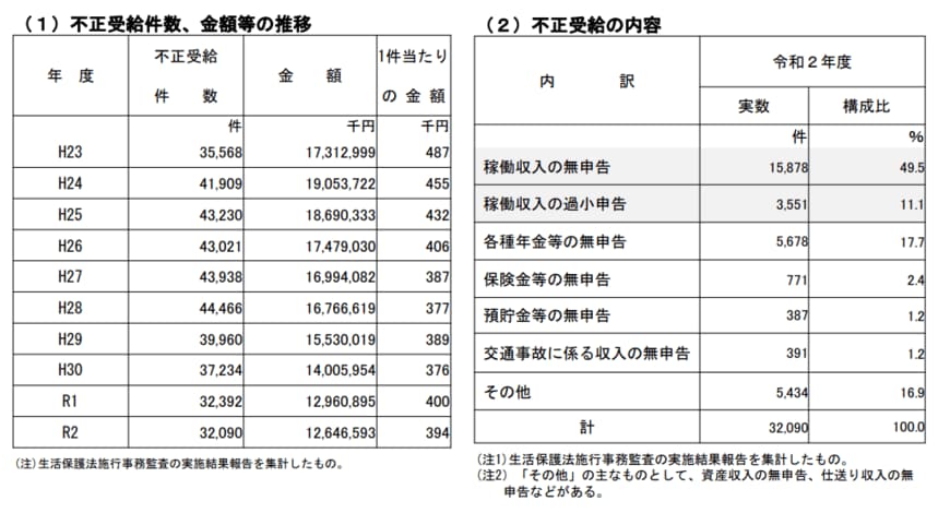 不正受給の内容としては、稼働収入の無申告や過小申告が約6割を占めていました。