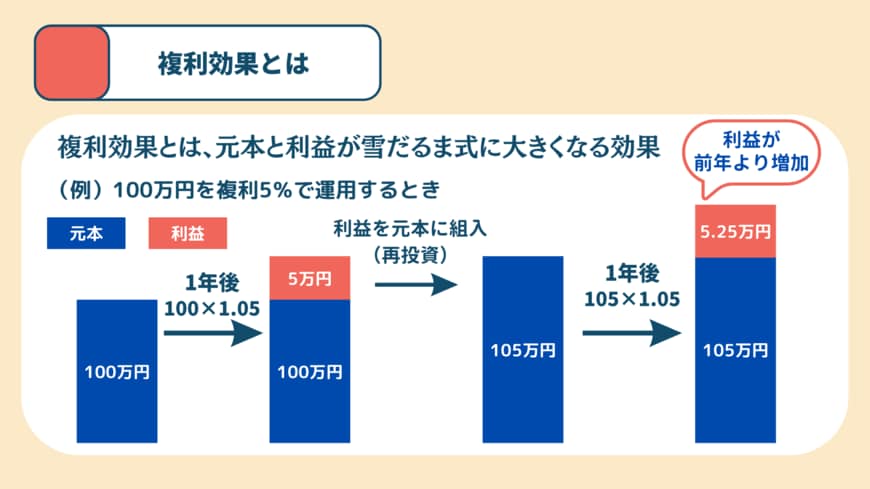 複利効果とは運用益を再投資していくことで元本と利益が相互に大きくなっていく効果のことです。
