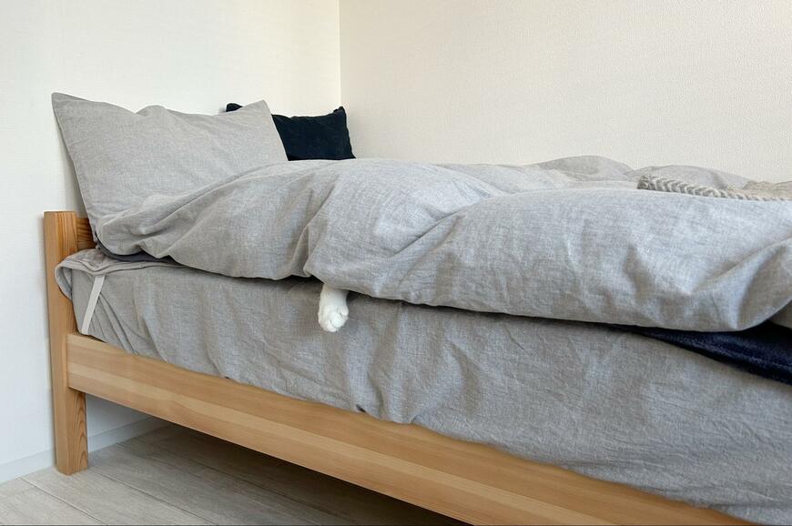 猫は何をして満喫していたのかというと…ベッドからニョキッと飛び出す足を見て納得。そう、ぐっすりと寝ていたのです。思わずホッコリしてしまいますね。