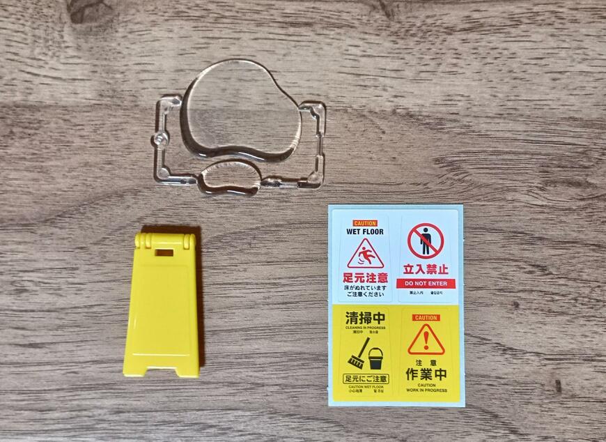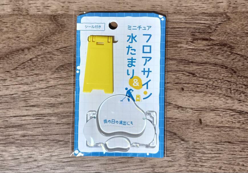 こちらが山田化学株式会社の「ミニチュア フロアサイン&水たまり」です。セリアやキャンドゥといった全国の100円ショップで購入することができます。筆者は、セリアで購入しました。