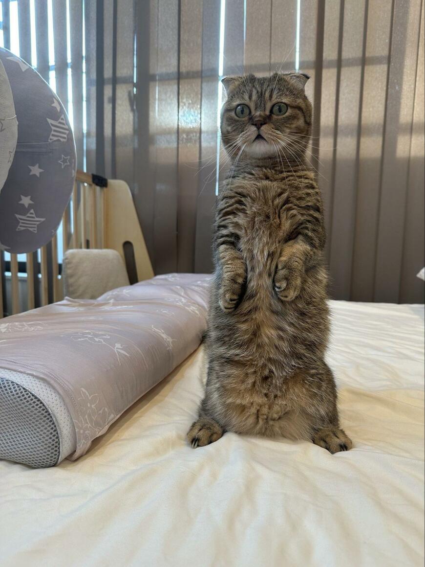 ベッドで仁王立ちする猫ちゃんの姿がX(旧Twitter)で注目を集めています。