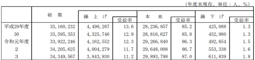 2021年(令和3年)度の繰上げ受給率は11.2%で、年々低下を続けています。一方、繰下げ受給は1.8%で、わずかながら増え続けています。