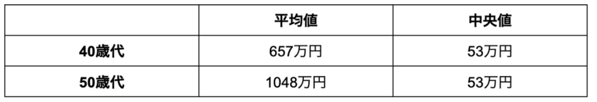 40歳代と50歳代のおひとりさま世帯の、平均貯蓄額の中央値はどちらも「53万円」となっており、貯蓄額が100万円に満たない世帯が多いことがわかります。