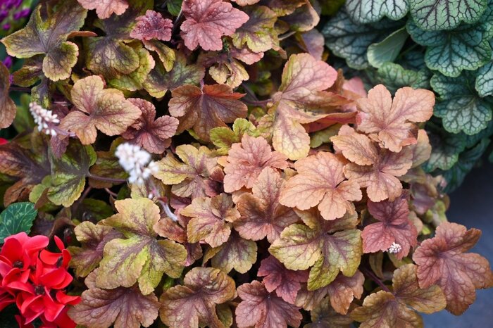 花よりも葉色のバリエーションを楽しむヒューケラ。カラーリーフプランツを代表する植物で、色とりどりの葉が庭のアクセントに。耐陰性があるので半日陰でも育てられます。※参考価格:400~600円前後(3号ポット苗)