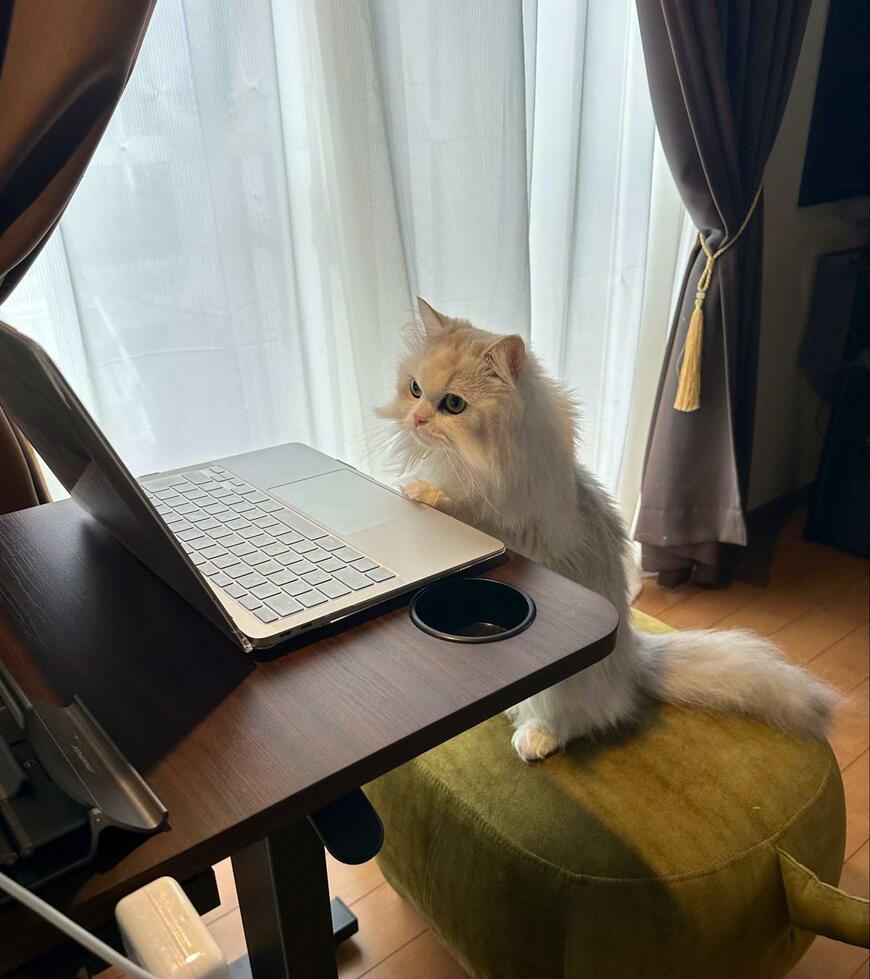 1枚目には、イスの上にちょこんと足を着いて、パソコンに手を添えるノーマンくんの姿があります。お姉さんとビデオ電話をされていたという投稿者さんですが、ノーマンくんも気になった様子。画面に映る御家族の姿を眺めているのでしょうか。パソコンの前で上手に佇む姿がかわいいです。