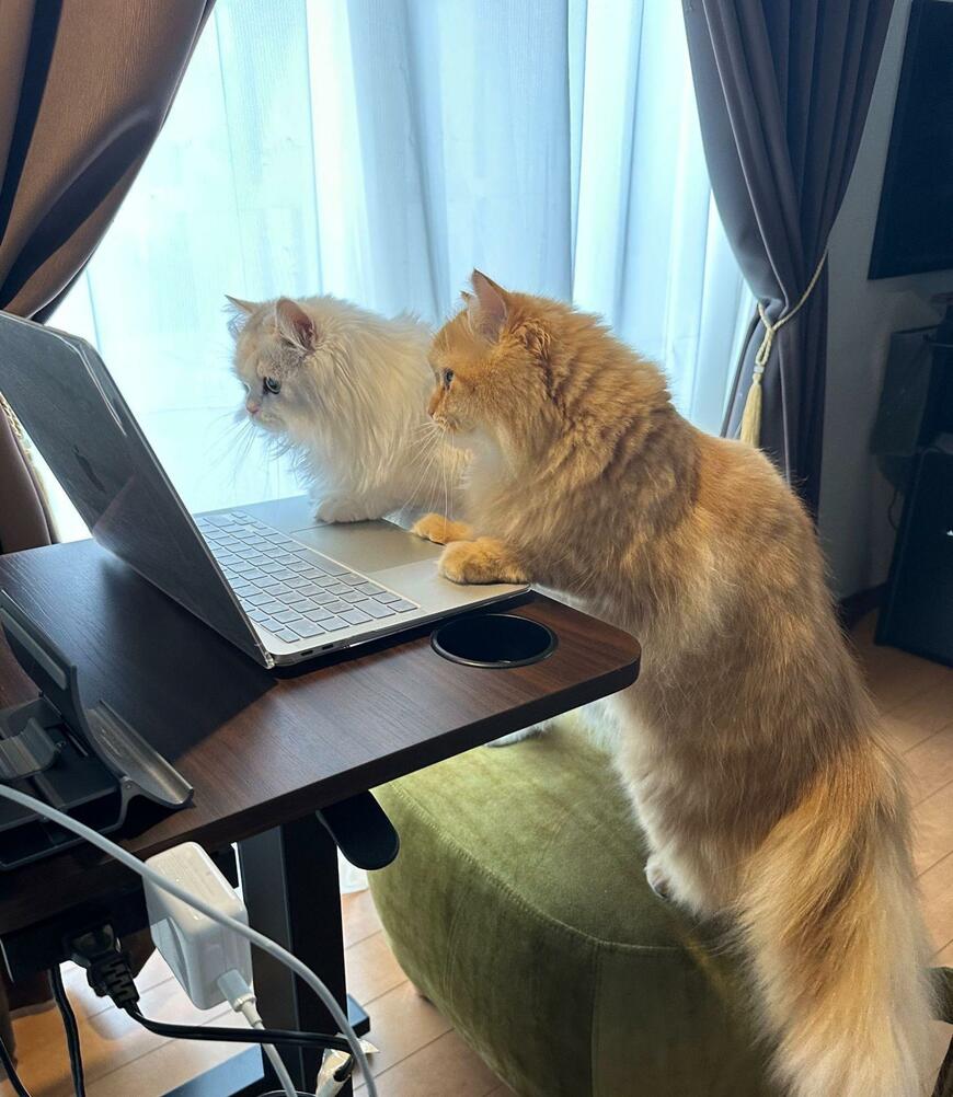 パソコンの前で「興味津々」な2匹の猫ちゃん