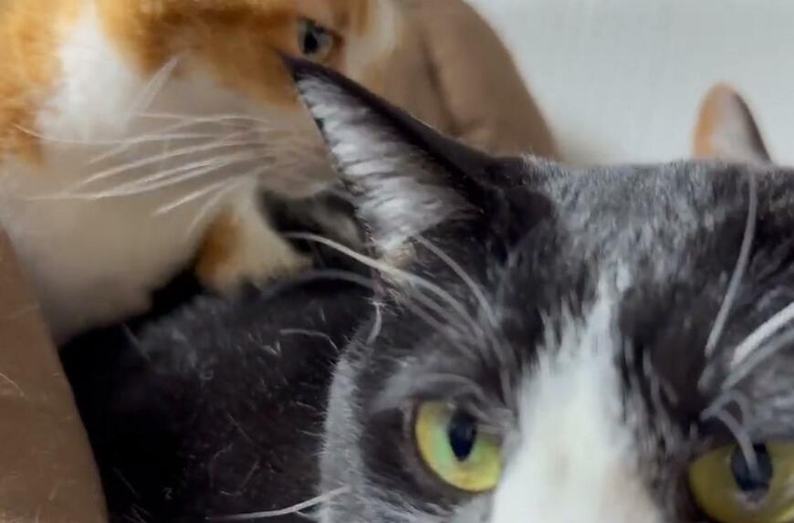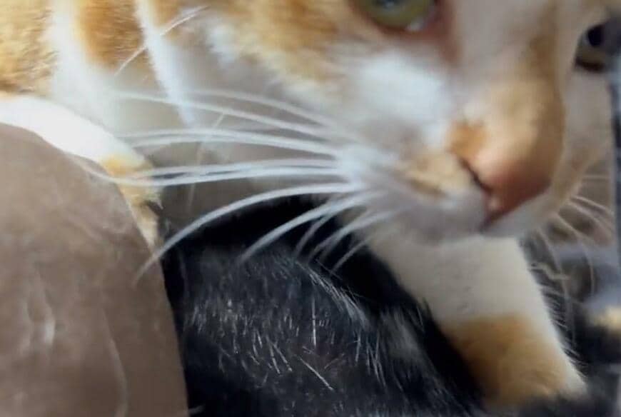 よく見るとちび太ちゃんは、同居猫「ジャガ姫」ちゃんの背中の上にスッポリと座っています。まるでお団子のようにぴったりと密着するちび太ちゃんは、しばらくすると「ふみふみ」と手を動かし始めました。