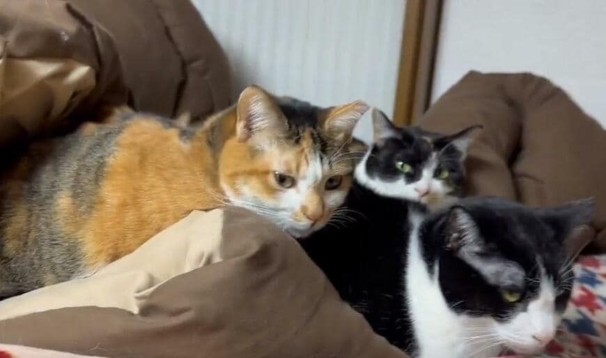 「今日のニャンはシャガ子を踏み台にするちび太」というコメントとともに投稿されたのは、布団でくつろぐ猫ちゃん達の動画でした。