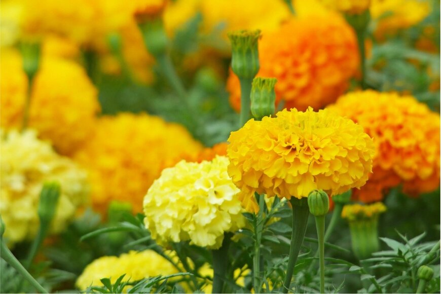 オレンジやイエローなど、明るい花色が特徴のマリーゴールド。強健な性質で、種からも育てやすい植物です。
