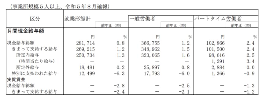 2023年10月24日、厚生労働省が発表した「毎月勤労統計調査(確報)」では、2023年8月の実質賃金はマイナス2.8%という結果でした。