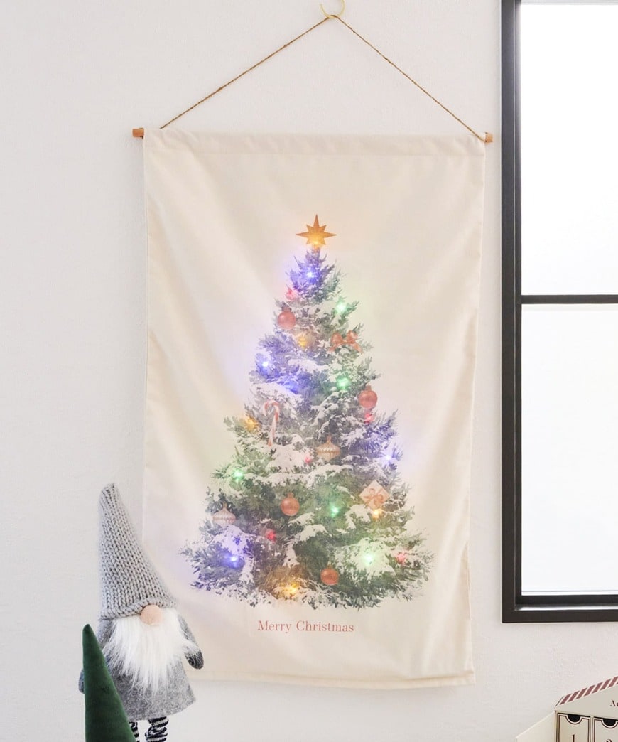 こちらは、クリスマスツリーデザインの「光るタペストリー」です。高さ86cm×幅52cmのアイテムです。大きくて存在感があるので、こちらを飾るだけでも一気にクリスマスらしい雰囲気を楽しむことができます。