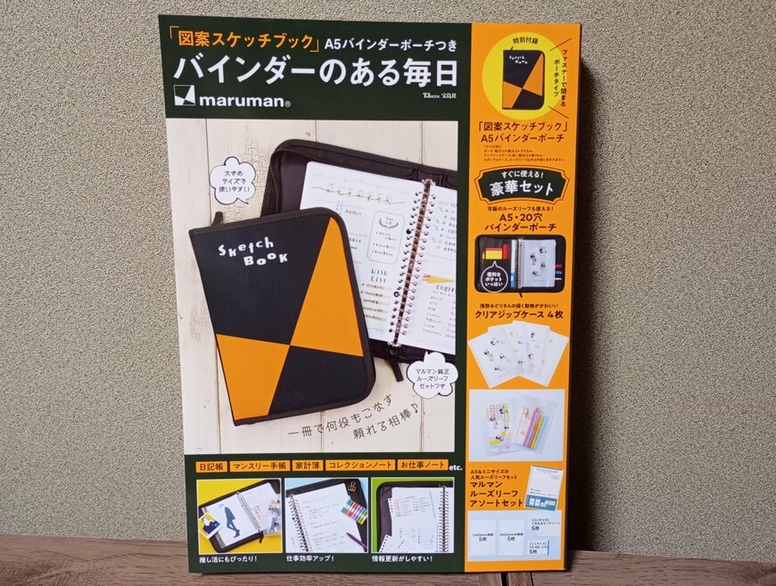 こちらが、宝島社から2023年10月16日に発行された『「図案スケッチブック」A5バインダーポーチつき バインダーのある毎日』です。手帳やルーズリーフの使い方を紹介したマガジンに、A5バインダーポーチなどが付録としてついてきます。