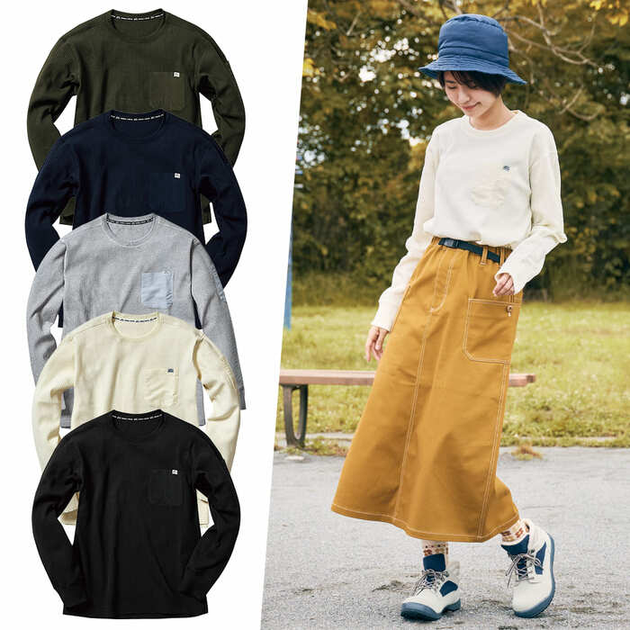 空気の層がほどよく保湿をしてくれるワッフル素材の「長袖クルーネック」です。価格は780円(税込)です。左胸のポケットがおしゃれです。