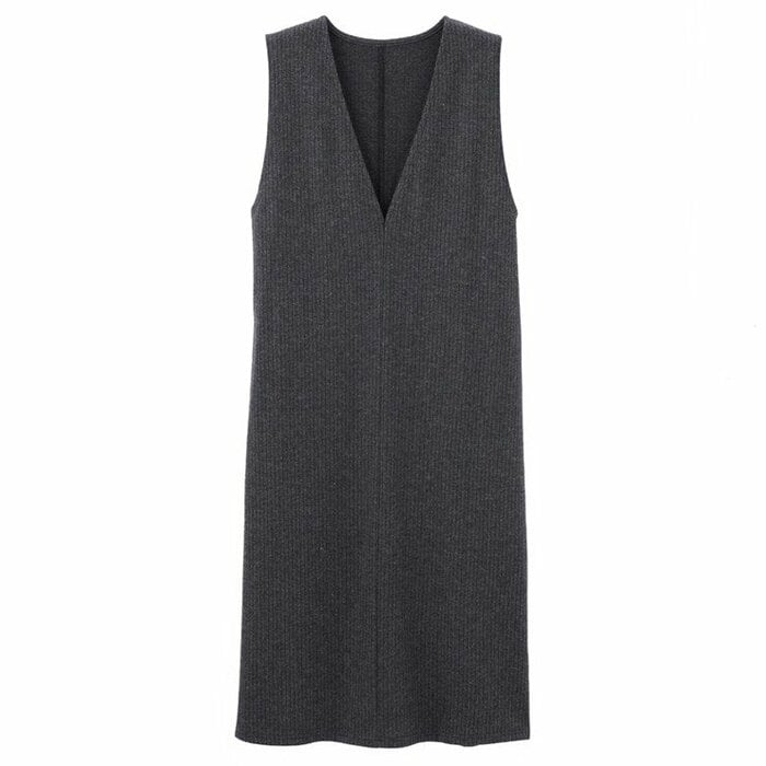ジャンパースカートは、深めのVデザインです。錯視効果で、顔回りをすっきりと見せてくれそうです。スッキリとしたシルエットのアイテムなので、着痩せ効果も期待できそうです。