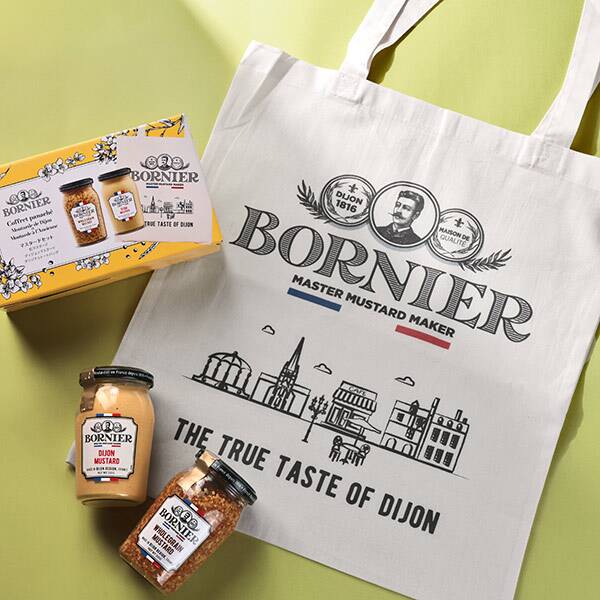 数量限定販売のこちらのセットは、ボルニエ粒マスタードとディジョンマスタードが各1本、ボルニエのオリジナルトートバッグが付いたお得なマスタードセット。