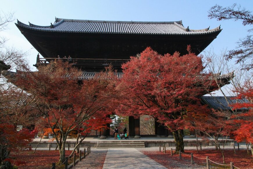 南禅寺は、京都の寺院のなかでも「別格」として扱われる格式の高いお寺です。勅使門・三門・法堂を繋げる1本道を囲むように木が植えられており、どこに目を向けても紅葉を見られます。