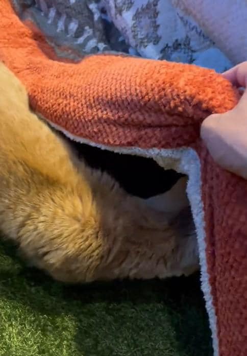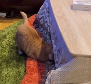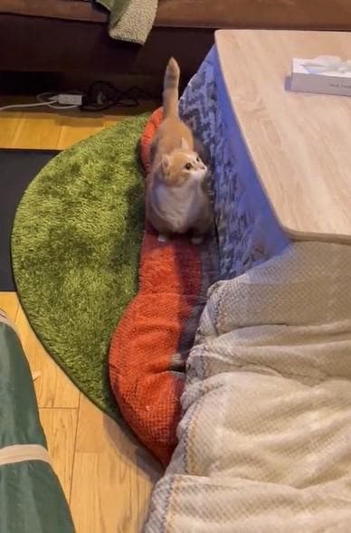 優しく声を掛けた飼い主さんが、こたつ布団を上げると……?虎太郎くんはちょっと立ち止まったあとに、「スルスル」と吸い込まれるように中へと入って行ったのでした。