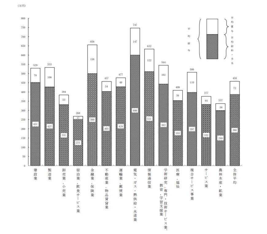 また、「情報通信業」は122万円と、平均年収が高い業種が続いています。