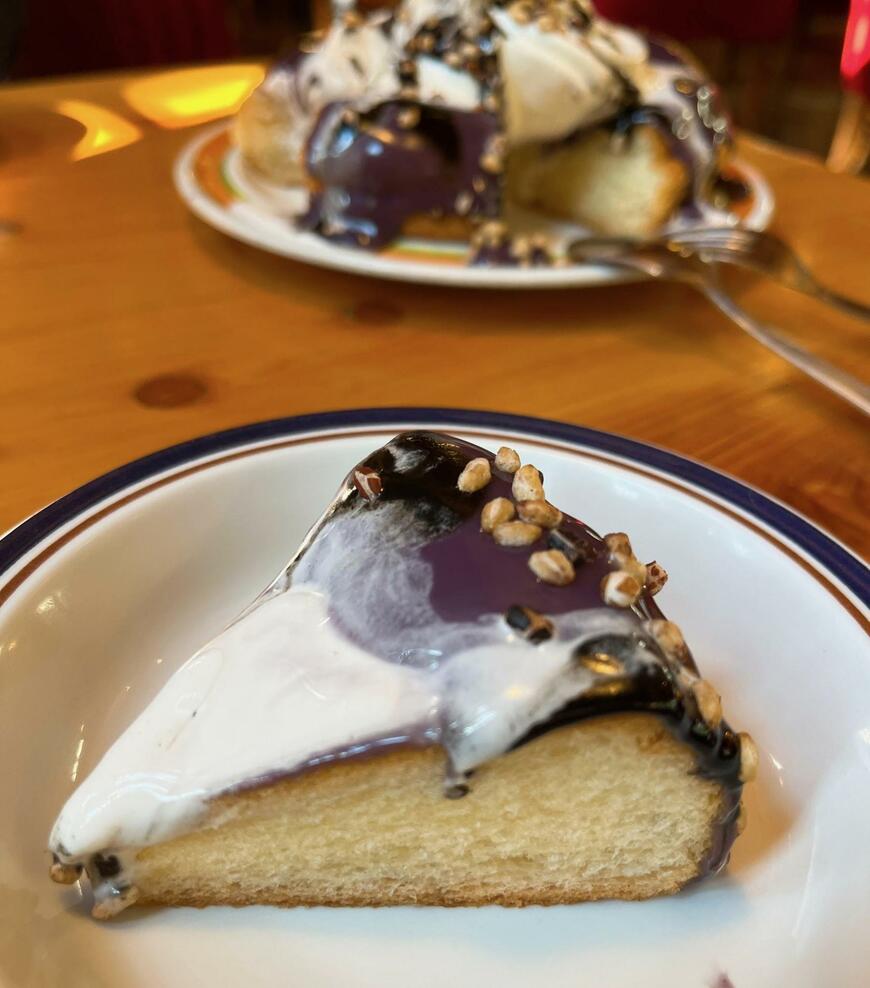 注文してから、あまり待たずに提供されました。紫いものソースはつやがあり、ほどよい粘度もありそうです。デニッシュの上でとろりと色を添えてくれています。