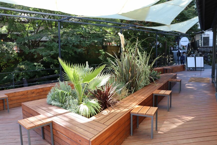 全てテイクアウトメニューですが、東京産の檜を使用したおしゃれなウッドデッキテラスで食事をすることができます。高尾山周辺では見られないユニークな形状の熱帯植物も植えられていて目を引きますね。