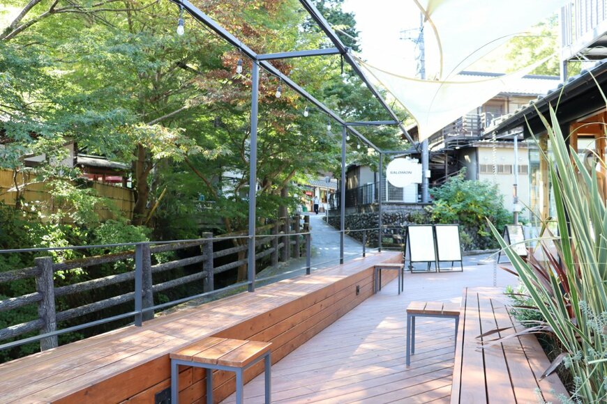 おすすめは高尾山に向かう通路側に面した席。11月中旬以降はこちらの木々が真っ赤に染まるため、紅葉と小川のせせらぎをじっくりと楽しめますよ。夜にはライトアップされるので、また違った雰囲気になりそうです。