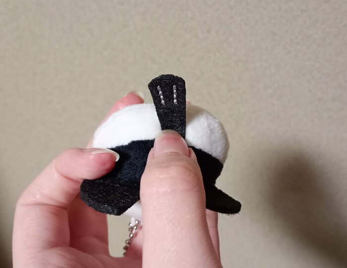 しっぽには縦線が刺繍されています。110円(税込)のマスコットながら、よくできています。