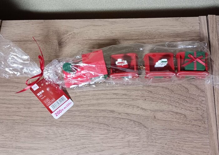 1. かわいいリボンでラッピングされています! ダイソーのクリスマス機関車