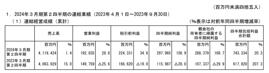 親会社株主に帰属する四半期純利益は、前年同期比+168.7%の2883億7900万円の大幅増益となったが、上記の補助金のほか、子会社の特別清算に伴い税負担が減少したことが影響した。