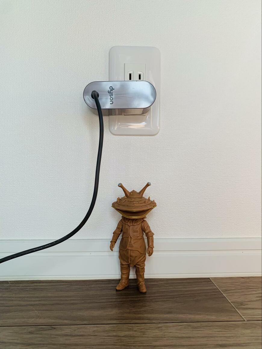 そこに収められていたのは、「ウルトラシリーズ」に登場する架空の怪獣「カネゴン」のフィギュア。カネゴンはコンセントの前に立ち、まるでコンセントを守っているかのようです。